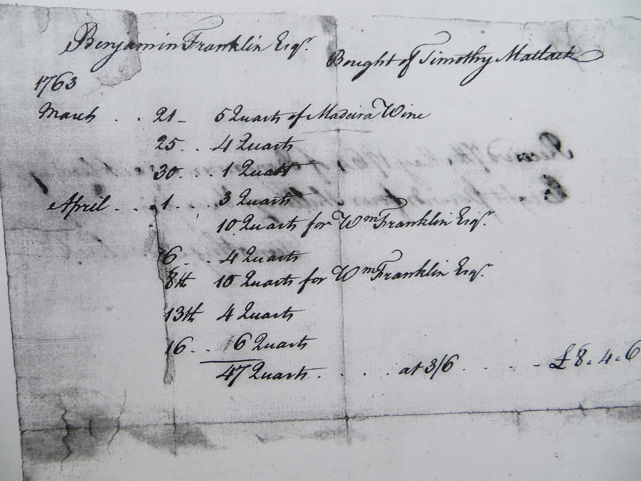 Benjamin Franklin purchased 47 quarts of Maderia Wine from Timothy in March and April 1763 |