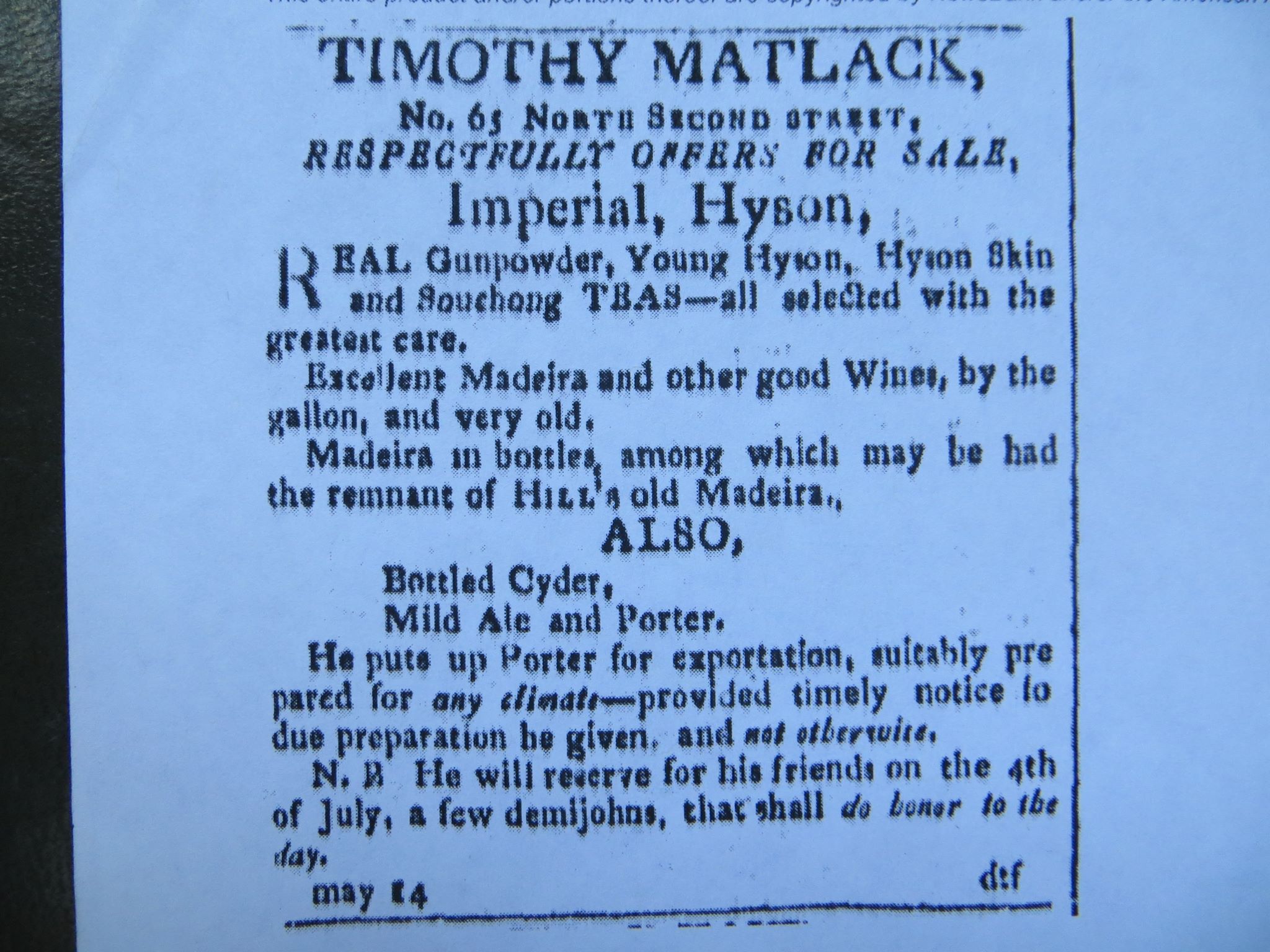 In 1810, Timothy Matlack offers Tea, Wine, Beer, and Cyder.
